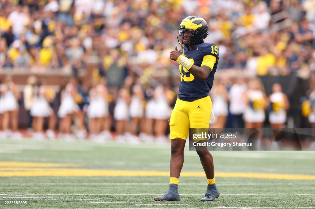 ANN ARBOR, MICHIGAN – SEPTEMBER 13: Bryce Underwood #19 of the Michigan Wolverines plays against the Central Michigan Chippewas at Michigan Stadium on September 13, 2025 in Ann Arbor, Michigan. (Photo by Gregory Shamus/Getty Images)