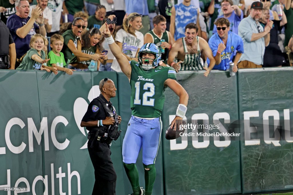NEW ORLEANS, LOUISIANA – SEPTEMBER 13: Quarterback Jake Retzlaff #12 of the Tulane Green Wave celebrates after he runs for a 20-yard touchdown in the second quarter against the Duke Blue Devils at Yulman Stadium on September 13, 2025 in New Orleans, Louisiana. It was Retzlaff ‘s third rushing touchdown of the first half. (Photo by Michael DeMocker/Getty Images)
