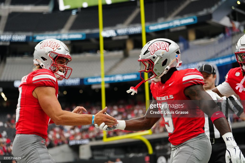 LAS VEGAS, NEVADA – AUGUST 23: Jai’Den Thomas #9 of the UNLV Rebels celebrates his score against the Idaho State Bengals with Anthony Colandrea #10 of the UNLV Rebels in the first half of a game at Allegiant Stadium on August 23, 2025 in Las Vegas, Nevada. (Photo by Louis Grasse/Getty Images)