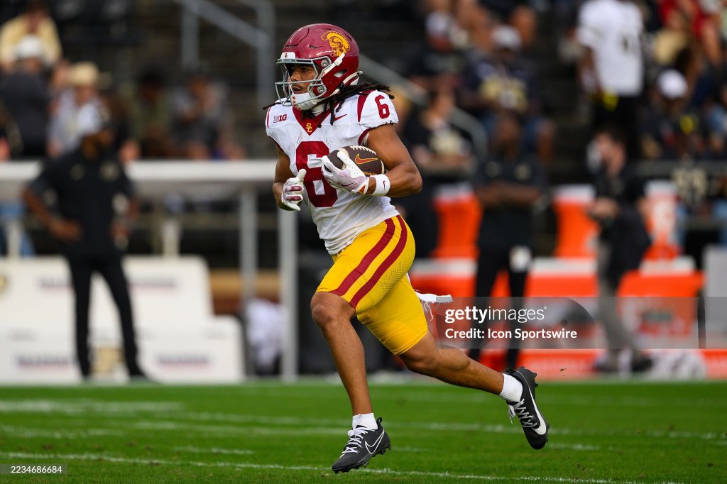 WEST LAFAYETTE, IN – SEPTEMBER 13: USC Trojans wide receiver Makai Lemon (6) warms up before the college football game between the Purdue Boilermakers and USC Trojans on September 13, 2025, at Ross-Ade Stadium in West Lafayette, IN. (Photo by Zach Bolinger/Icon Sportswire via Getty Images)