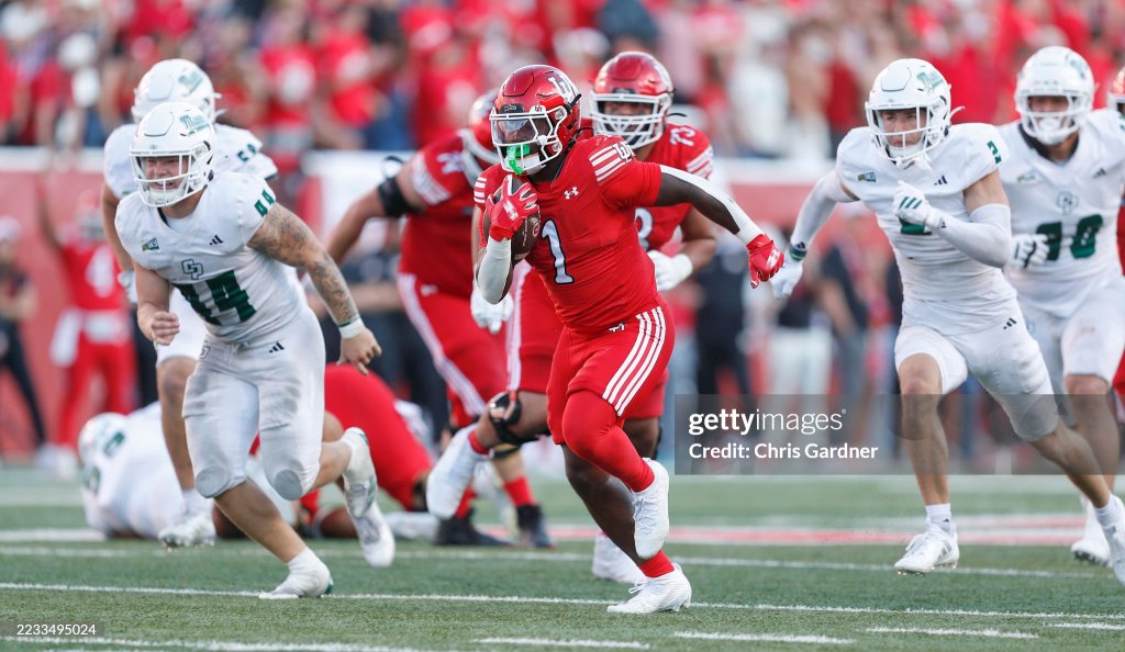 SALT LAKE CITY, UT – SEPTEMBER 6: Wayshawn Parker #1 of the Utah Utes rushes for a touchdown against Mikey D’Amato #44 and Troy Bean #2 of the Cal Poly Mustangs during the second half of their game at Rice-Eccles Stadium on September 6, 2025 in Salt Lake City, Utah. (Photo by Chris Gardner/Getty Images)