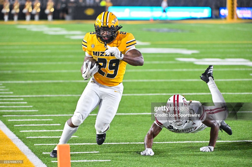 COLUMBIA, MO – SEPTEMBER 27: Missouri Tigers running back Ahmad Hardy (29) shrugs off the tackle attempt of Massachusetts Minutemen defensive lineman Zachary Farris (29) to slip into the end zone for a touchdown during a non conference game between the Massachusetts Minutemen and the Missouri Tigers held on Saturday September 27, 2025 at Faurot Field at Memorial Stadium in Columbia MO. (Photo by Rick Ulreich/Icon Sportswire via Getty Images