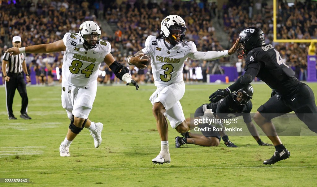 FORT WORTH, TEXAS – OCTOBER 04: Kaidon Salter #3 of the Colorado Buffaloes carries the ball for a touchdown as Namdi Obiazor #4 of the TCU Horned Frogs defends during the first half at Amon G. Carter Stadium on October 4, 2025 in Fort Worth, Texas. (Photo by Ron Jenkins/Getty Images)