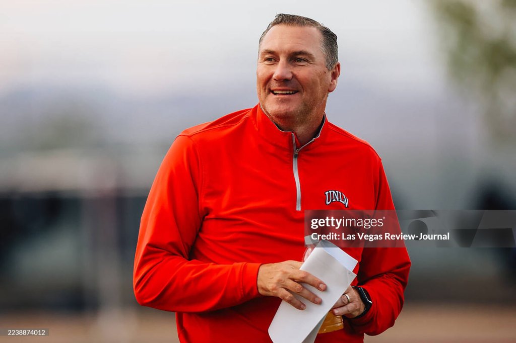 UNLV head football coach Dan Mullen smiles on the sidelines during a high school football game at Foothill High School on Sept. 26, 2025, in Henderson, Nevada. (Madeline Carter/Las Vegas Review-Journal/Tribune News Service via Getty Images)