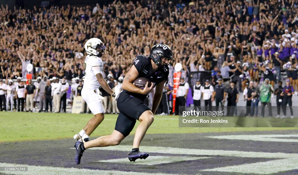 FORT WORTH, TEXAS – OCTOBER 04: Joseph Manjack IV #14 of the TCU Horned Frogs catches a touchdown pass as Preston Hodge #4 of the Colorado Buffaloes looks on during the second half at Amon G. Carter Stadium on October 4, 2025 in Fort Worth, Texas. (Photo by Ron Jenkins/Getty Images)