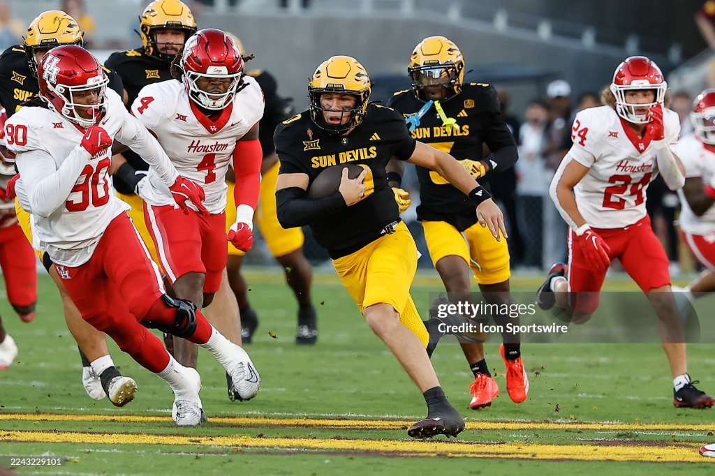 TEMPE, AZ – OCTOBER 25: Arizona State Sun Devils quarterback Sam Leavitt (10) runs the ball during the college football game between the Houston Cougars and the Arizona State Sun Devils on October 25, 2025 at Mountain America Stadium in Tempe, Arizona. (Photo by Kevin Abele/Icon Sportswire via Getty Images)